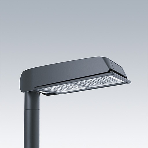 Lanterne d’éclairage routier LED de taille Large avec 48 LED et une optique Route étroite 700mA. Electronique,Classe électrique II, IP66, IK08. Corps : aluminium (EN AC-44300) Moulage sous pression, gris anthracite 900 sablé thermopoudré. Fermeture : verre plat trempé. Cadre blanc avec un bord gravé. Vis : Acier inox, traitement Ecolubric®. Livré avec un adaptateur d’emmanchement Ø 76 mm qui convient pour montage top (inclinaison 0°/5°/10°) ou latéral (inclinaison -20°/-15°/-10°/-5°/0°). Equipé d’un circuit de réduction de puissance, contrôlé par un câble à phase commutée supplémentaire. MARCHE = 100 %, ARRET = 50 %. Livré avec LED 4 000 K. Protection contre la surtension : mode commun à une impulsion 10 kV et mode commun multi-impulsions 8 kV et mode différentiel multi-impulsions 6 kV. Si un système DALI permanent est connecté, mode différentiel et mode commun multi-impulsions 6 kV.