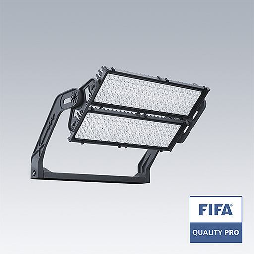 Projecteur LED haute puissance avec distribution lumineuse Optique 1 : faisceau étroit; Optique 2 : faisceau étroit; de 336 LED. Appareillage externe, Fourni uniquement par Thorn Lighting, à commander séparément (courant de transmission maximum 1050 mA) et câblage via câble de type H07 RN-F et mini-diamètre de 13 mm. Classe électrique I, IP66, IK08. Dissipateur thermique : Moulage sous pression aluminium thermopoudré gris foncé (similaire à RAL 7043). Support de fixation et cadre : gris foncé (similaire à RAL 7043). Fermeture : 4 mm transparent verre. Fourche montée à l’aide des points de fixation disponibles (une vis M20 et deux vis M14). Fonctionnement à faibles papillotements (< 1 %) adapté à une diffusion TV haute définition. Livré avec LED 4 000 K
