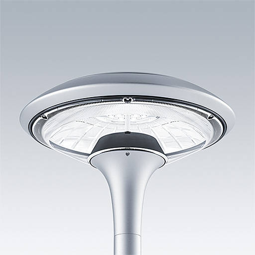 Plurio Direct : Lanterne LED décorative à montage top avec distribution Radialement symétrique. Driver avec 18 LED entraînés à 1,05A. Classe électrique I, IP66, IK08. Base : coulé aluminium, thermopoudré gris argent. Chapeau : forme disque, aluminium, texturé gris argent. Diffuseur : anti-UV, transparent Polycarbonate (PC) avec prismes anti-éblouissement. Optique à lentille direct avec réflecteur interne Equipé d'un 50% circuit de réduction de puissance, qui entre en vigueur 3 heures avant et 5 heures après un minuit calculé. Il peut être désactivé à l'installation avec un interrupteur interne facilement accessible. Livré avec LED 4 000 K. Montage top sur mât de Ø 60mm.