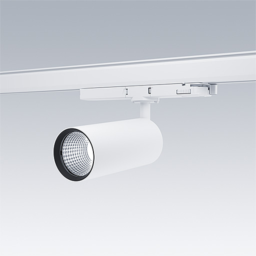 Projecteur LED pour installation sur rail triphasé avec distribution lumineuse de type projection et température de couleur stabilisée. Electronique, non gradable. Classe électrique II, IP20. Corps : aluminium Moulage sous pression, peinture microtexturée blanc. Réflecteur : PC poudré. Projecteur orientable sur le plan horizontal de 360° et inclinable sur le plan vertical de 90°. Livré avec LED 3 000 K