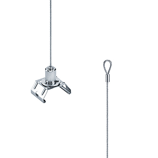 Linupphängning med slinga (diameter: 6 mm) för anslutning av ledningsskena utan verktyg med CLIX-teknik. Fästklämmor av V2A rostbeständigt fjäderstål. Lina av galvaniserat stål. Kontinuerlig höjdjustering. Linan kan kapas till önskad längd. Maximal belastning: 30 kg. Fästklämmans mått: 28 x 42 x 9 mm.