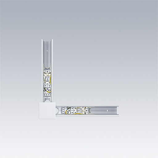 L-formad mekanisk och elektrisk kontakt, vit. Med två honändar för mekanisk anslutning och 2 grupper av kopplingsplintar för elektrisk in- eller utgång.