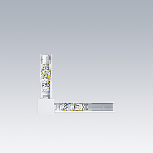 L-formad mekanisk och elektrisk kontakt, vit. Med en hanände och en honände för mekanisk anslutning och 2 grupper av kopplingsplintar för elektrisk in- eller utgång.