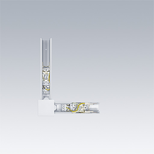 L-formad mekanisk och elektrisk kontakt, vit. Med en hanände och en honände för mekanisk anslutning och 2 grupper av kopplingsplintar för elektrisk in- eller utgång.
