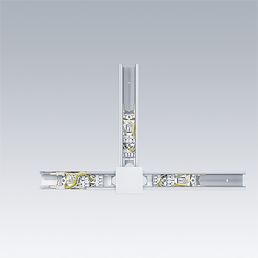 T-formad mekanisk och elektrisk kontakt, vit. Med två honändar och en hanände för mekanisk anslutning och 3 grupper av kopplingsplintar för elektrisk in- eller utgång.
