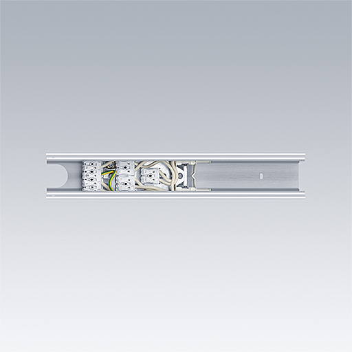 Vit elektrisk matningsenhet av rullformat plåtstål för elanslutning av rampsystem. Stickanslutna terminaler för 5 nätkablar, 2 x 2 kablar för nödbelysning och 2 styrkablar. Inkluderar gavlar och skydd som förhindrar oavsiktlig kontakt med elektriska ledare.