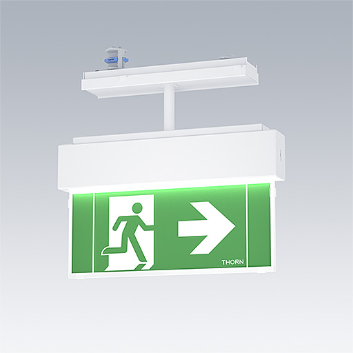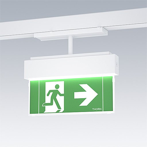 LED-armatur för säkerhetsskylt för verktygsfri montering på Thorn Contus skensystem. Skylten kan roteras och fixeras i steg om 45°.